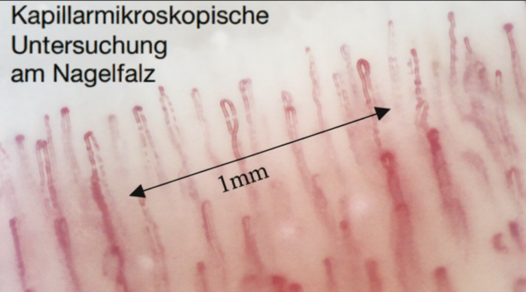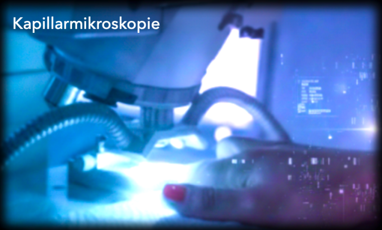 Mittels Kapillarmikroskopie werden an den Fingern am Nagelfalz die feinen Kapillaren sichtbar gemacht und deren Durchblutung in Echtzeit angezeigt.