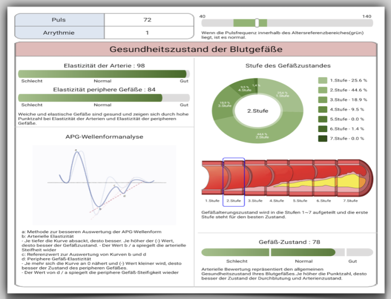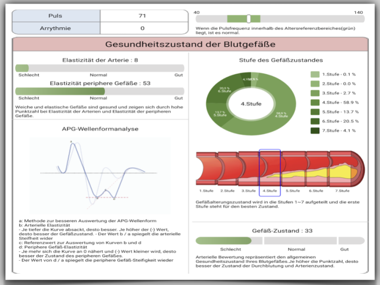 Besorgniserregend war die Elastizität der Gefäße (Arterial Elasticity), welche laut Messung kaum noch vorhanden war.